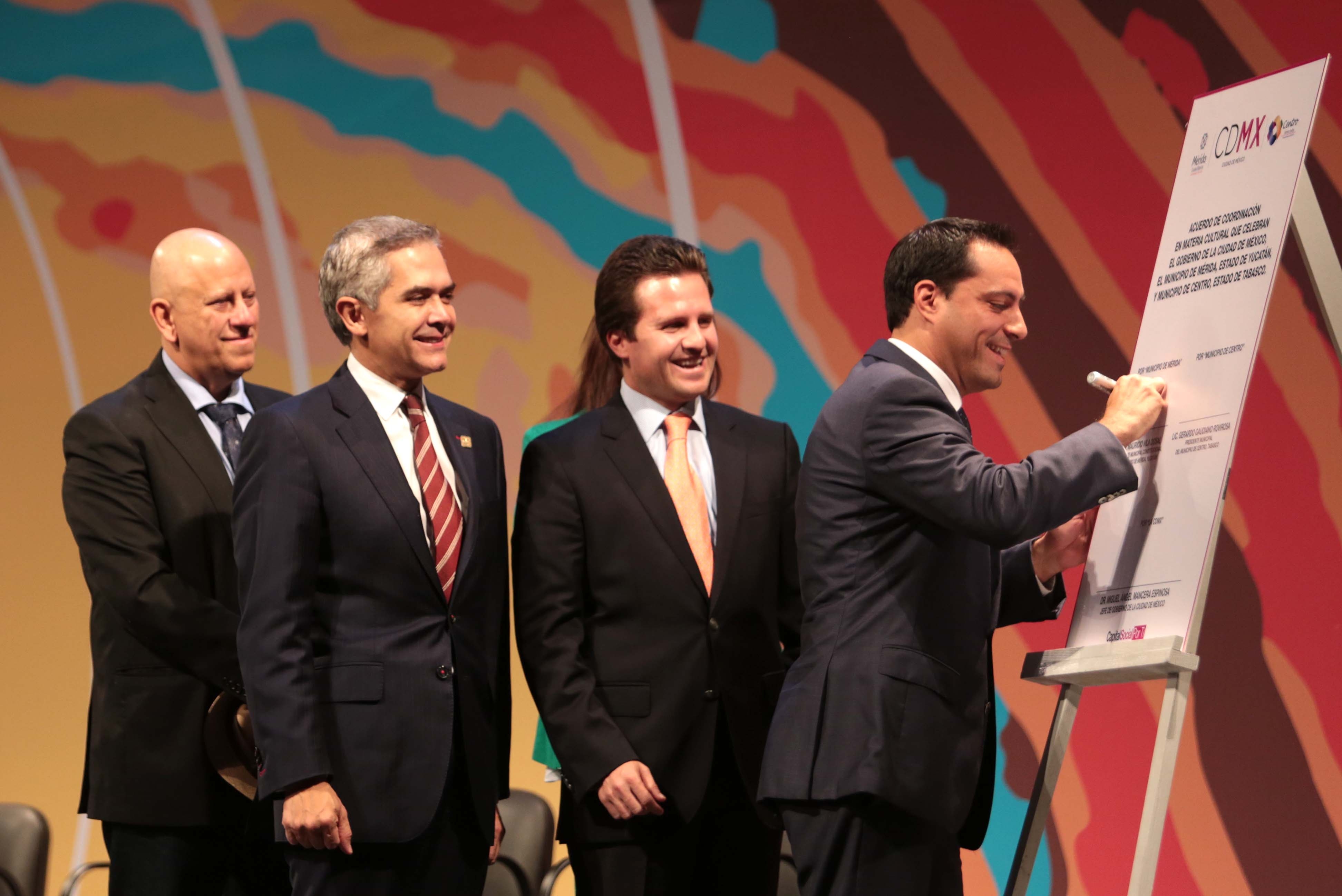 El alcalde Mauricio Vila Dosal firmó anoche un acuerdo de coordinación en materia cultural con el Jefe de Gobierno de la Ciudad de México, Miguel Angel Mancera Espinosa y el alcalde de Villahermosa, Tabasco, Gerardo Gaudiano Rovirosa.
