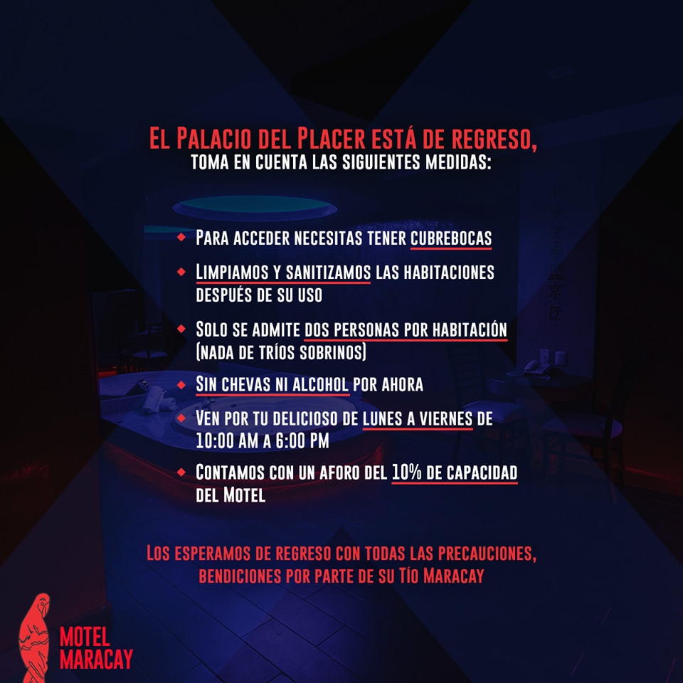 Para acceder a dichos recintos es necesario portar cubrebocas; y únicamente se admite a dos personas por habitación. Asimismo, está prohibida la venta y consumo de bebidas alcohólicas en las instalaciones.