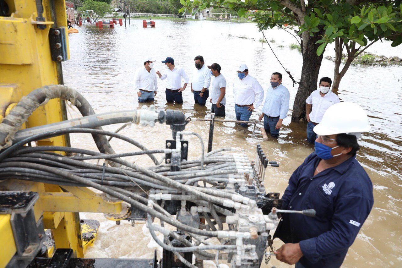 Vila Dosal entregó agua purificada, maíz, alimentos y víveres. También supervisó el inicio de los trabajos de perforación de pozos pluviales para que disminuya el nivel del agua tras las inundaciones por la tormenta tropical [i]Cristóbal[/i].