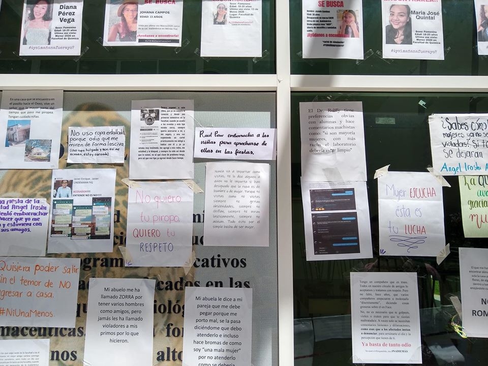 A través de tendedores y carteles distribuidos en los muros de las escuelas, alumnas de facultades como Matemáticas, Medicina, Contaduría y Administración de Derecho, Odontología, Química, Campus de Arquitectura, Hábitat, Arte y Diseño, entre otras, evidenciaron los casos de acoso y agresiones que han sufrido no sólo por estudiantes, sino por personal académico y administrativo.