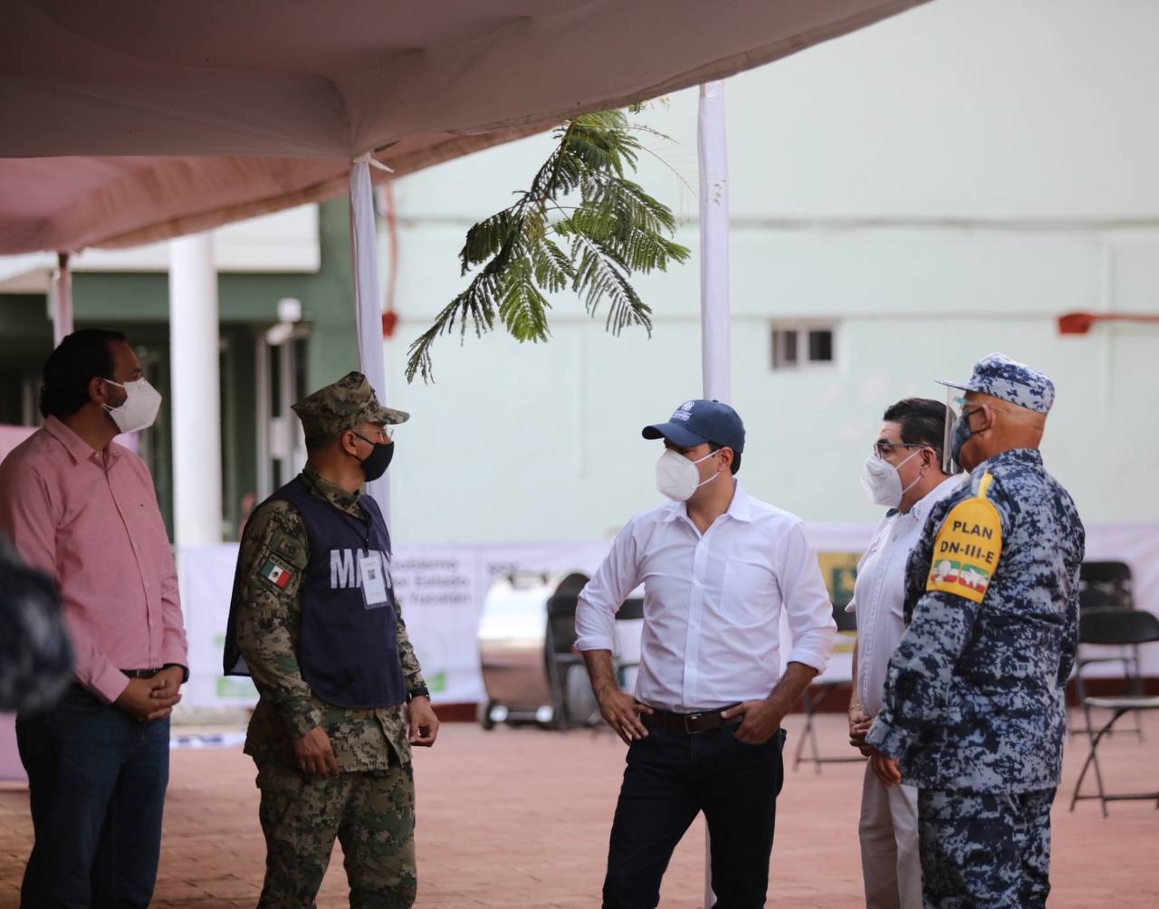 Acompañado del coordinador Estatal para la Vacunación Covid-19, capitán de Corbeta Carlos Gómez Montes de Oca y del comandante de la Base Aérea Militar Número 8, General de Ala Piloto Aviador Juan Ángel Jardón Aguilar, Vila Dosal verificó la preparación de este Colegio, así como la operatividad de las áreas que conforman este proceso, que son registro, triage, vacunación y recuperación, todo con el fin de corroborar que el procedimiento se lleve a cabo de forma ágil y en orden.