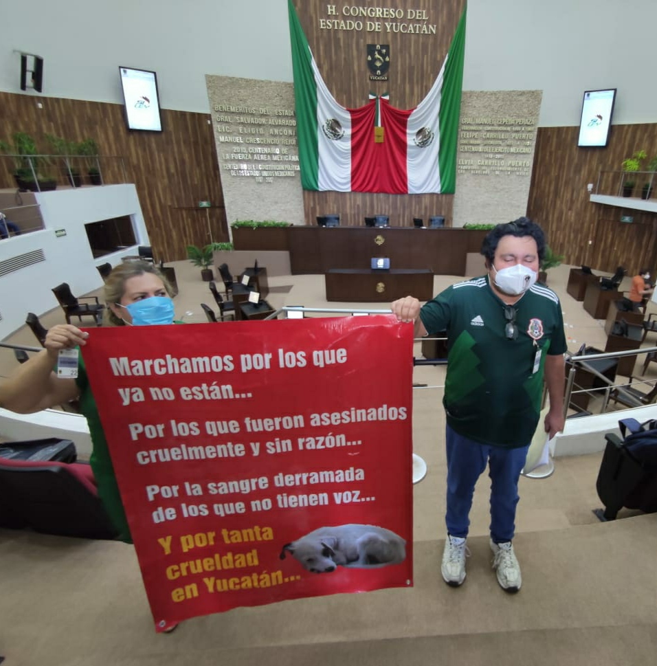 La mañana de este miércoles, un grupo de activistas por los derechos de los animales protestó en el Congreso del estado en contra la propuesta de un diputado priísta quien en días pasados presentó una iniciativa con miras a declarar a las corridas de toros, peleas de gallos y calesas tiradas por caballos como Patrimonio Cultural Intangible de Yucatán.