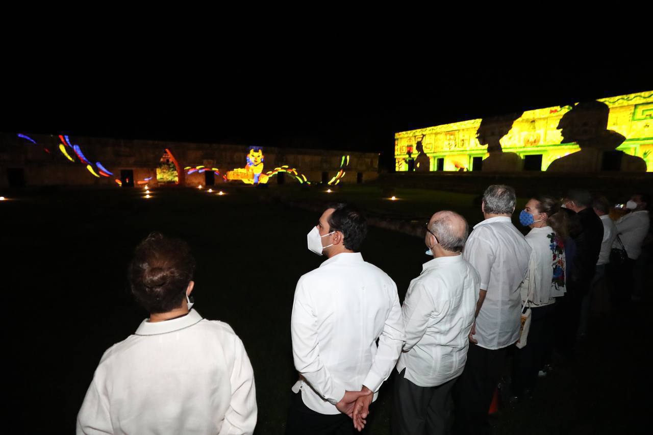 Los vestigios de los antepasados mayas cobran vida en Yucatán a través del espectáculo audio-lumínico Ecos de Uxmal, función que presenció la noche de este jueves el gobernador Mauricio Vila Dosal en la zona arqueológica del mismo nombre en compañía del secretario general de la Organización Mundial de Turismo (OMT), Zurab Pololikashvili; el secretario de Turismo del Gobierno federal (Sectur), Miguel Torruco Marqués y el director del Instituto Nacional de Antropología e Historia (INAH), Diego Prieto Hernández.