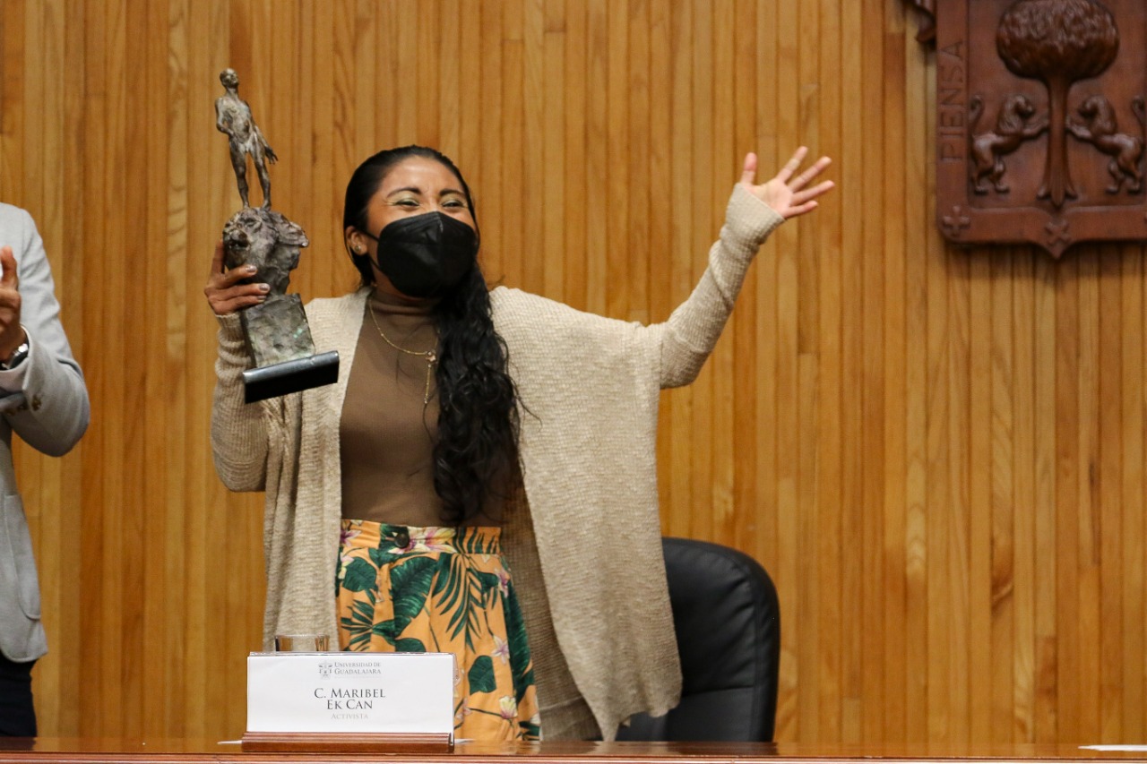 Maribel Ek Can, integrante de la comunidad de Homún, Yucatán, sostiene con orgullo y alegría el galardón Corazón de León, lo alza con sus manos extendidas, -como si quisiera traspasar el techo del auditorio y rozar el cielo- ante la ovación de las y los asistentes.