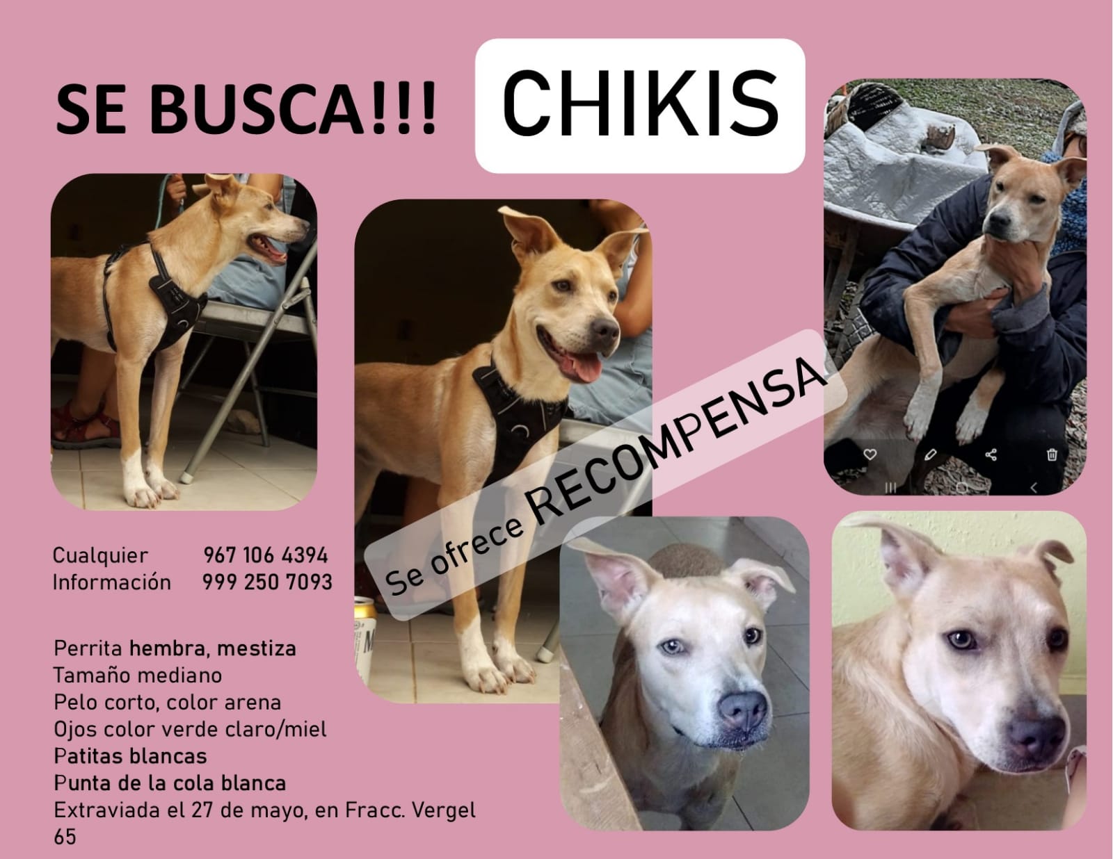 Chikis es una perra mestiza de año y medio, color miel y de talla mediana que se perdió por el rumbo de Vergel 65, la última vez que se le vio fue el 27 de mayo. Desde aquel día, Bárbara ha empleado sus ahorros de dos años para dar con su paradero. Pese a tener que retornar a su tierra, asegura que, de no aparecer, continuará con los esfuerzos para rencontrarse con ella.