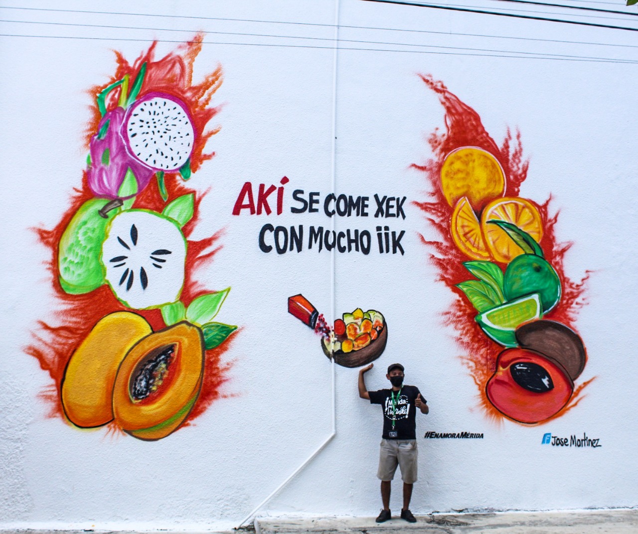 Durante casi tres horas José Martínez, muralista, estuvo pintando la pared número 92 con las frutas y verduras que ahora se pueden observar a un costado de Akí Xtra Montejo. Reconoció que fue cansado, pero espera que se vea a este tipo de pinturas como arte.