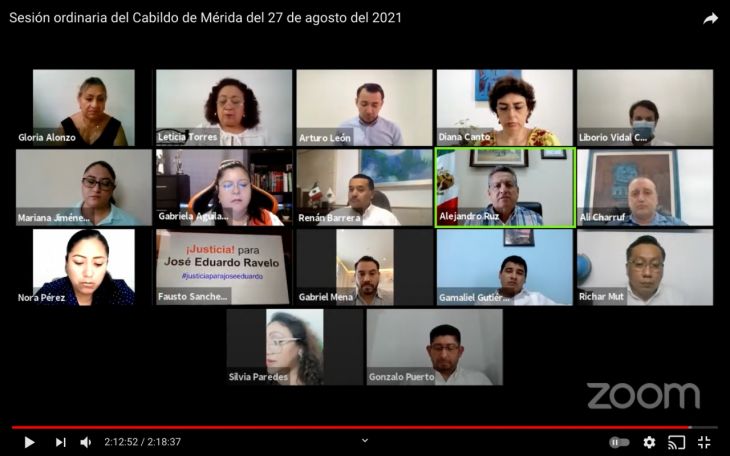 Durante la última sesión ordinaria del actual cabildo de Mérida, realizada de manera en línea este 27 de agosto, el regidor de Morena, Fausto Sánchez López, mostró un cártel en su pantalla donde puso leer la frase “¡Justicia! para José Eduardo Ravelo" acompañada de hashtag #justiciaparajodeeduardo.