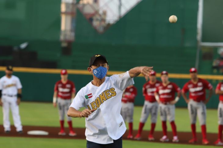 Tras la presentación de los equipos, Sáenz hizo el lanzamiento de la primera bola con Jesús Aguilar y Aguilar, director de Bienestar Social del Ayuntamiento de Mérida, como bateador. Los acompañó Horacio de la Vega, presidente de la Liga Mexicana.