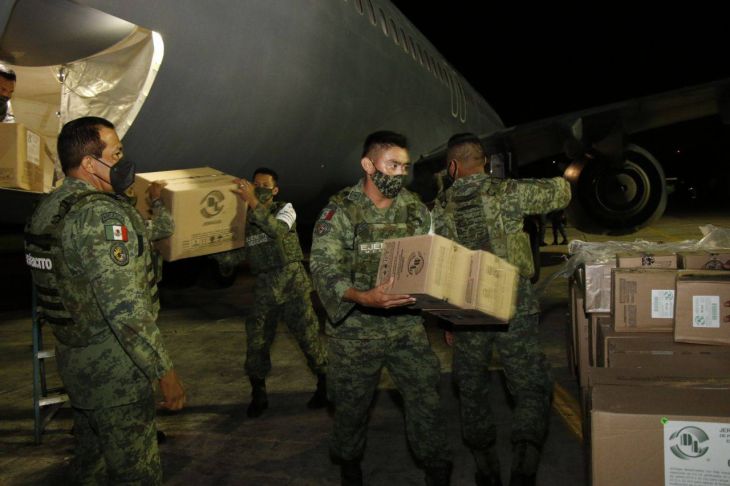 En el arribo del nuevo lote de vacunas, también estuvieron presentes el coronel Gustavo Caratachea Esparza, comandante del 11 Batallón de Infantería, y el general de Grupo Piloto Aviador José de Jesús Morán Gutiérrez, comandante de la BAM número 8.