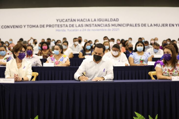 Acompañado de las titulares de la Secretaría General de Gobierno (SGG), María Fritz Sierra, y de la Semujeres, María Cristina Castillo Espinosa, el gobernador agradeció a las alcaldesas y los alcaldes, por el compromiso demostrado en este tema, y les reiteró que se tiene la responsabilidad de convertir a Yucatán en un estado todavía mejor, donde se brinde oportunidades y se proteja a las mujeres.