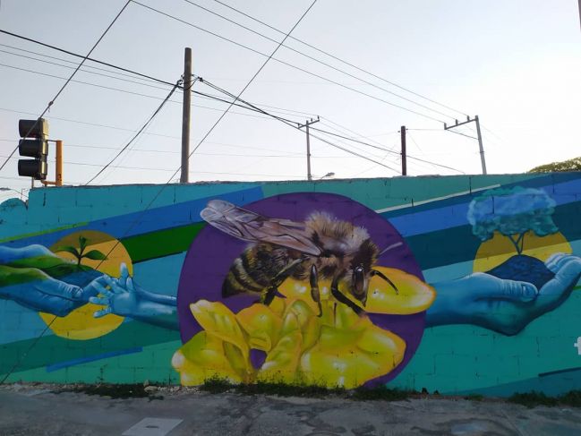 El proyecto arrancó en el mes de marzo, en un paredón de la colonia El Porvenir, sobre la avenida Mérida 2000. En ese sitio, el artista plasmó un mural en el que figura una abeja con motivo del Día Mundial de la Madre Tierra.
