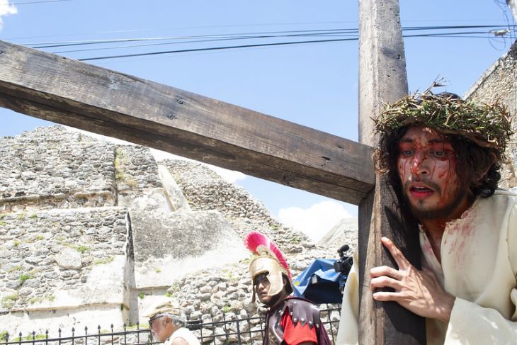 La corona y sus espinas descienden violentamente sobre la frente del Cristo que encarna Andrés Medina, dejando una roja estela que detona las burlas de los soldados romanos. En las tribunas, hay rostros que se desencajan y gente ávida de chicharrones con salsa Valentina y bolis de colores fosforescentes, para saciar su sed.