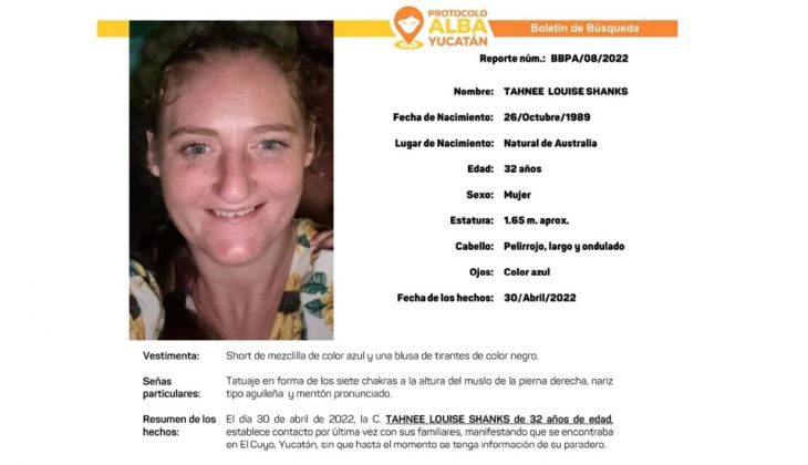 A través de sus redes sociales, la dependencia estatal informó de la activación del Protocolo Alba en el Estado de Yucatán, para la búsqueda y localización de Tahnee Louise Shanks de 32 años de edad, originaria de Australia, estatura: 1.65 metros, aproximadamente, cabello pelirrojo, largo y ondulado; ojos color azul.