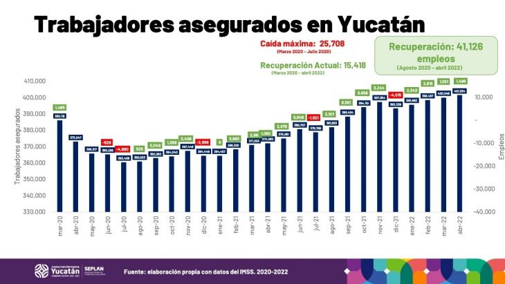 Solo entre abril de 2021 y el mismo mes, pero de 2022, se generaron 29 mil 449 nuevos empleos, cifra superior al promedio nacional de 29 mil 402. Durante los cuatro primeros meses de 2022, se registró un incremento de 2.1 por ciento en el número de trabajadores asegurados, mismo que es superior al reportado a nivel nacional, que fue de 1.9 por ciento. De igual manera, en ese mismo periodo, se generaron 8 mil 195 nuevos empleos.
