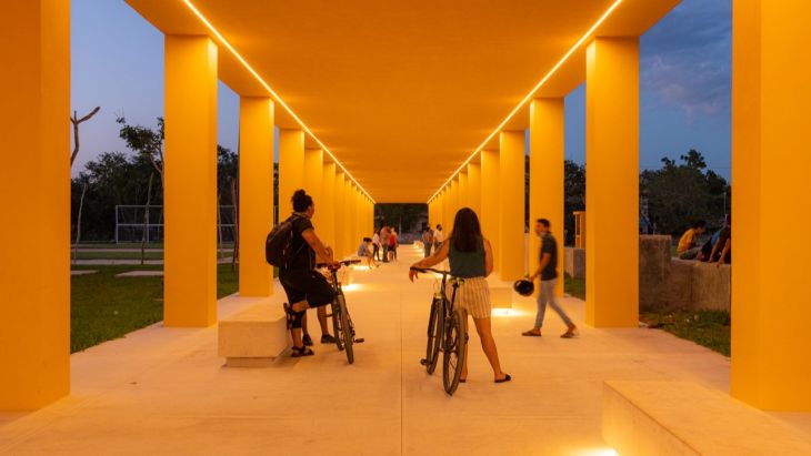 Durante una gira de trabajo por la comunidad, el titular de la Sedatu, Román Meyer Falcón, comentó que las obras en Izamal mantienen el color amarillo característico del pueblo y son espacios bien iluminados para que niñas, niños y jóvenes disfruten de las áreas deportivas y de recreación a cualquier hora.