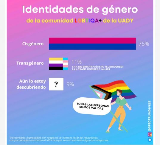 Mientras que en el rubro de identidad de género, 75 por ciento se identifica como cisgénero, 11 por ciento transgénero; en este apartado 8.4 por ciento se identifica como no binarie/género fluido/queer y 2.4 por ciento trans hombre o mujer; un 9 por cierto dijo que “aún lo estoy describiendo”.
