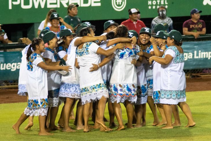 El estadio tuvo que seccionarse para que se jugara sóftbol, y justo después de esta división, estaban Las Amazonas calentando con su característico hipil y una gorra verde esmeralda de los Leones de Yucatán.
