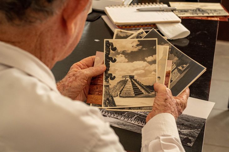 Abreu Méndez, a sus 82 años, mira sus fotografías y recuerda que, antes, en Chichén Itzá había libre acceso para visitar todas las construcciones e incluso subir a ellas, logrando capturar escenas que ahora solamente serían posibles con un drone, pero sin disfrutar de la experiencia sobre las rocas.