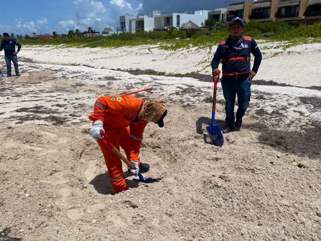 La dirección de Protección Civil, con el apoyo de personal de la Secretaría de Salud, Desarrollo Sustentable y elementos de la Secretaría de Marina y el Ejército continúan las labores de limpieza en un tramo de 4 kilómetros entre playa entre San Benito y Uamitún, donde se recolectaron y enterraron 125 kilos de especies marinas.