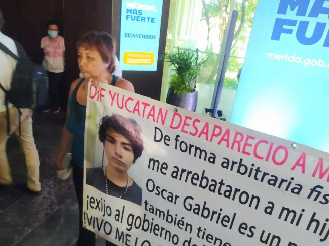 A tres días de iniciar un plantón en el palacio de gobierno de Yucatán para exigir respuesta a las autoridades por la desaparición de su hijo Oscar Gabriel G.F., de 15 años, oriundo de Veracruz, la señora Margarita Fernández llevó su protesta al Centro Internacional de Congresos (CIC), donde el alcalde de Mérida, Renán Barrera, rindió su primer informe a la ciudadanía.