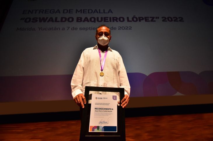 El doctor en literatura Jorge Alberto Cortés Ancona fue galardonado este miércoles con la Medalla Oswaldo Baqueiro López al Periodismo Cultural, que recibió de manos de la titular de la Secretaría de la Cultura y las Artes de Yucatán (Sedeculta), Loreto Villanueva Trujillo.