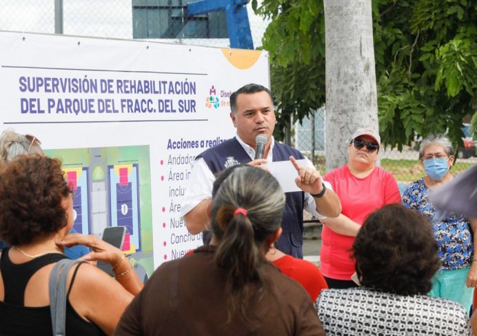 Durante una visita de supervisión al parque del Fraccionamiento del Sur, ubicado en la calle 59 entre 46 y 48, el presidente Municipal indicó que “gracias a la participación ciudadana y a la contribución de la población se pueden ejecutar obras que permitan disfrutar de la ciudad y formar mujeres y hombres de bien que cuiden de ella”.