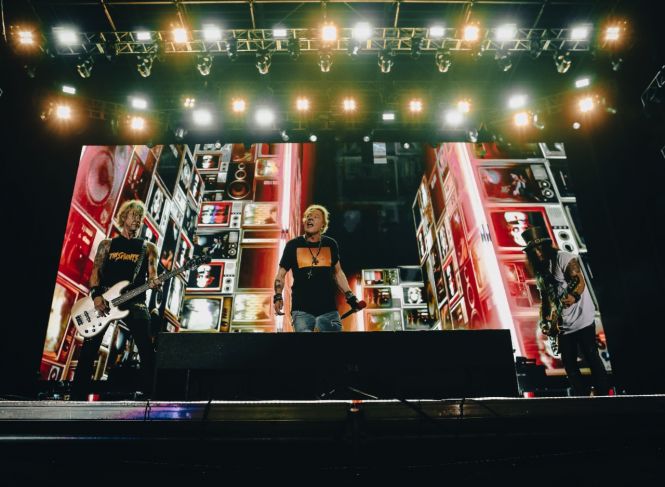 Luego de los arreglos pertinentes por parte del equipo de la banda, su escudo se dibujó en las pantallas anunciando su presencia y desatando la algarabía. Una nutrida ovación antecedió los pasos de Axl, Slash y Duff y es así como dio inicio uno de los conciertos más esperados que han ocurrido en la capital de Yucatán.