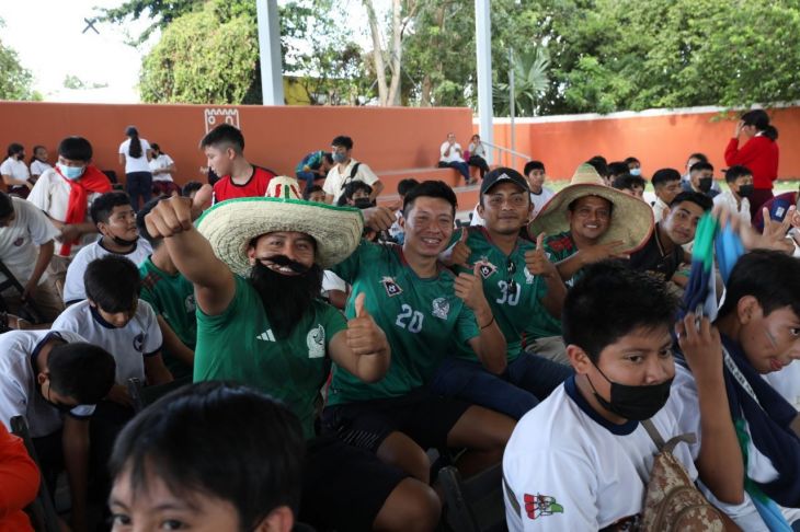 A través de una mega pantalla, los asistentes, quienes portaban la playera oficial para enviar desde Yucatán todo su apoyo a la Selección nacional, pudieron disfrutar de la transmisión del partido de México contra Arabia Saudita, en la cancha techada de la avenida Ricardo Palmerín.