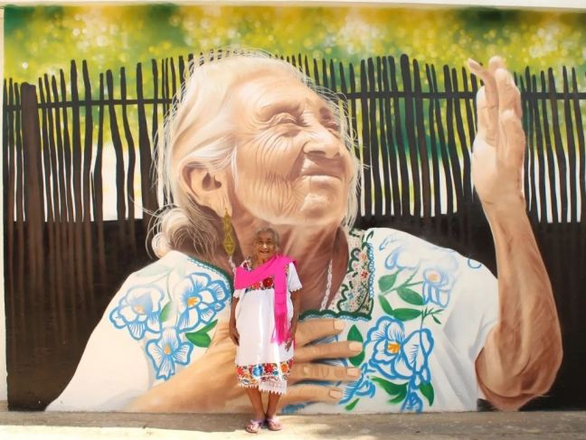 El grafitero yucateco mejor conocido como Datoer realizó un mural en honor a Bacila Tzec Uc, la última partera viva en la comunidad de Yaxhachén, Oxkutzcab, y promovió la colecta de recursos para ayudar a la mujer.