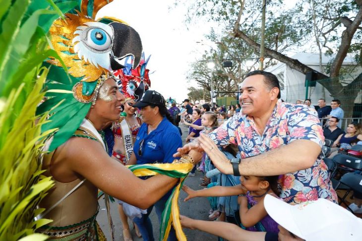 El alcalde Renán Barrera Concha acudió acompañado de su familia para compartir con los más de 148 mil personas que esperaban el inicio del desfile, donde esparcieron la diversión en grande los 19 carros alegóricos, en los cuales destacaron los temas dedicados a las diferentes culturas del mundo.