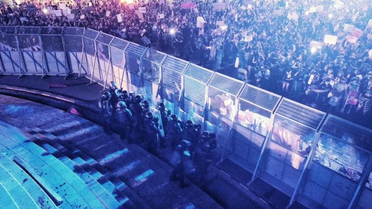 En el Monumento a la Patria, las asistentes a la marcha no sólo se encontraron con muros de contención, sino también con la presencia de elementos de la SSP, quienes resguardaban con escudos el inmueble.
