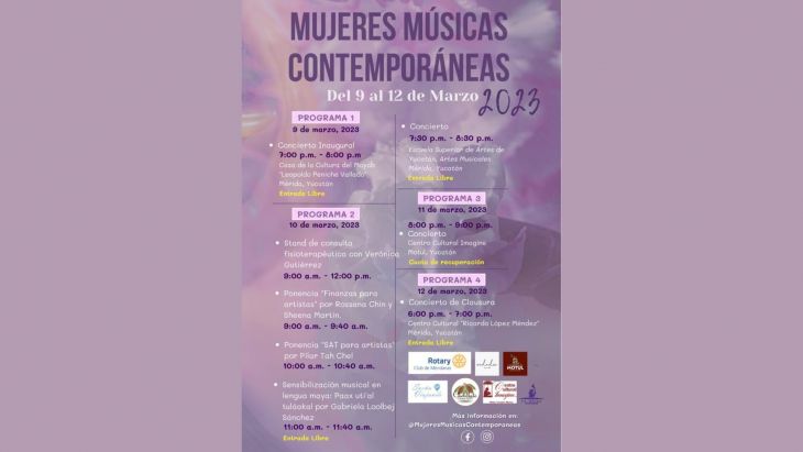 Mañana, 10 de marzo, iniciarán las ponencias en la Escuela Superior de Artes del Estado de Yucatán (ESAY), en donde hablarán del “SAT para artistas” y “Finanzas para artistas” y posteriormente por la noche tendrán el concierto de 10 intérpretes de diferentes autoras.