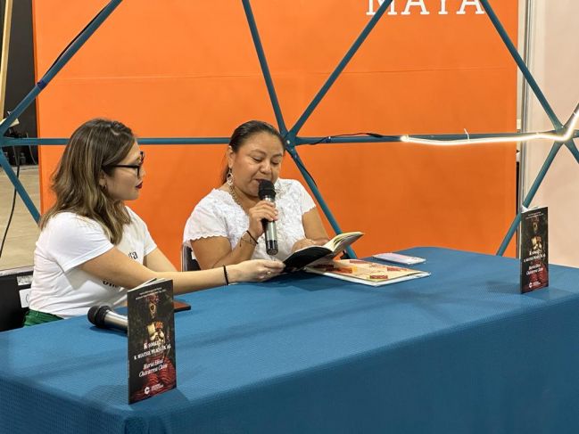 La presentadora invitó al público a aventurarse a leer un libro escrito completamente en maya porque dijo que, además de un reto, también es un regalo, “un manjar de letras”.
