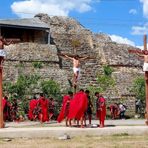 Por octava ocasión el joven de 26 años, Andrés Medina Chalé, encarnó a Cristo durante la representación de su pasión, que tradicionalmente termina en la crucifixión que se lleva a cabo en la pirámide de los Mascarones.