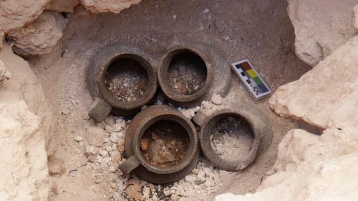 Informó que la disposición de las cuatro vasijas evoca las cuatro esquinas del universo y los cuatro puntos cardinales, que contenía un líquido sagrado como alimento de los dioses. Un cajete trípode con sonaja (para el servicio de alimentos), el cual aún conserva policromía, cubría las cuatro vasijas, como un contenedor que alude al cosmos y la continuidad armónica del universo.