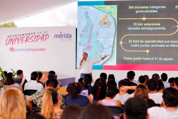 El alcalde de Mérida, Renán Barrera Concha, presentó en la Universidad Tecnológica Metropolitana el programa Ayuntamiento en mi Universidad, el cual consiste en 300 servicios municipales dirigidos a la población estudiantil. Durante el evento, los jóvenes interesados pudieron dialogar con el edil y realizar propuestas para mejorar el entorno urbano en las universidades.