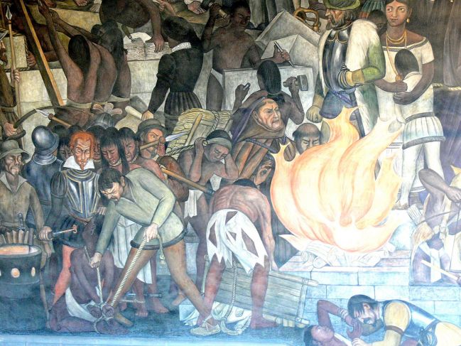 El mural Epopeya del pueblo mexicano es una gran pieza que permanece en los muros de Palacio Nacional, en la Ciudad de México, y que recuerda cómo el arzobispo Fray Diego de Landa ordenó incinerar miles de objetos mayas para imponer la religión cristiana.