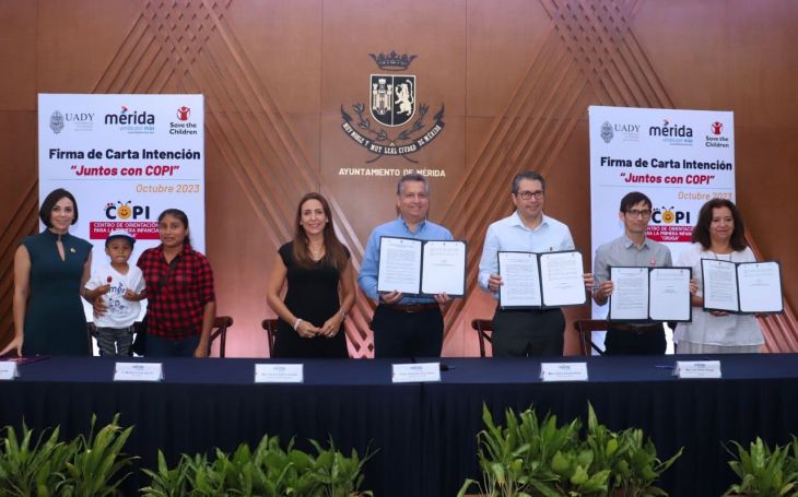 La presidente del DIF Mérida, Diana Castillo Laviada, acompañada del secretario municipal, Alejandro Ruz Castro; Carlos Estrada Pinto, rector de la Universidad Autónoma de Yucatán (UADY), e Inti Torres Villegas, coordinador regional sureste de Save the Children, firmaron una carta intención Juntos con COPI, la cual tiene el objetivo de sumar esfuerzos para reforzar la atención integral de niños que acuden al centro Oruga desde la etapa prenatal hasta los cinco años.