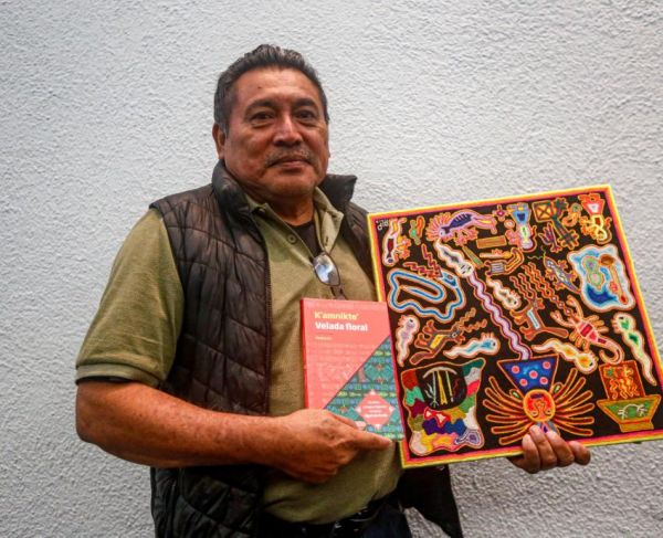 La actriz y activista Ofelia Medina fue la encargada de entregar a Uc un cuadro huichol elaborado con estambres, un símbolo, un nearika, la palabra sagrada de los wixáricas que son de estas tierras, porque ustedes los mayas y ellos son los guías de esta humanidad doliente.