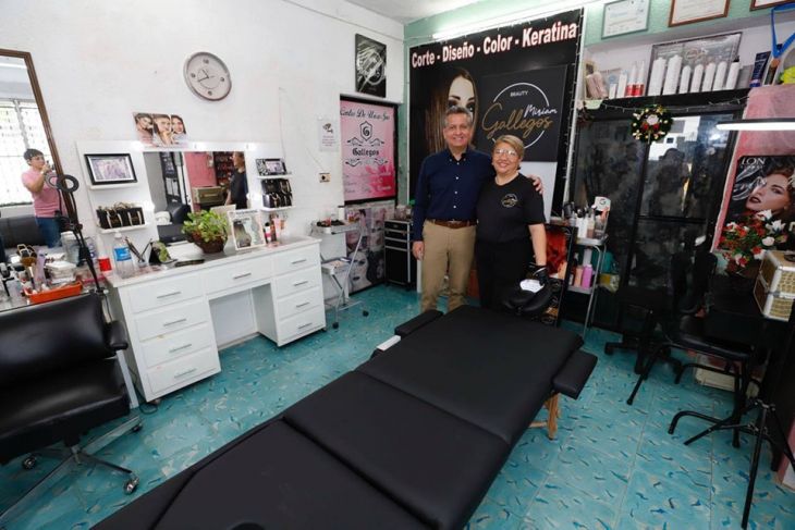 El alcalde de Mérida, Alejandro Ruz Castro, entregó este jueves una cama spa reclinable para Miriam Gallegos Garza, propietaria del salón de belleza que lleva su nombre, ubicado en la calle 46 N° 545 por 73-A Centro, que forma parte del programa de Apoyos directos de autoempleo que entrega la Dirección de Desarrollo Social.