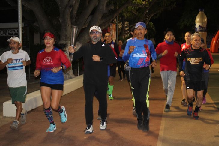 Jorge Esteban Abud, director del IDEY, acompañado por Johansen Macías Medina, representante de la Asociación Civil "Acciones Deportivas de los Amigos del estadio" y Jesús Molina Torres, administrador de esta unidad deportiva, estuvieron desde muy temprano en el inmueble para conmemorar este aniversario con la antorcha que salió desde la plaza principal para encender el pebetero y dar el disparo de salida para los corredores que iniciaron un largo recorrido para dar las vueltas a la pista de tartán del inmueble, que abrió sus puertas en 1939.