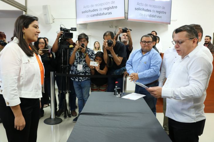 La aspirante a la gubernatura de Yucatán, Vida Gómez Herrera, y el candidato a la alcaldía de Mérida, Gerardo Ocampo, ambos del partido Movimiento Ciudadano, registraron esta mañana sus candidaturas ante el Instituto Electoral y de Participación Ciudadana (Iepac).