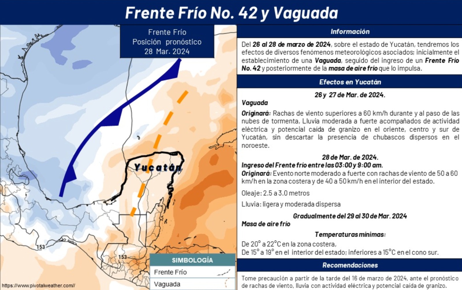 Desde la tarde del 26 y 27 de marzo en el territorio yucateco comenzarán a sentirse los efectos del Frente Frío número 42 que estará ingresando la mañana del jueves 28 de marzo, informó Protección Civil de Yucatán (Procivy).