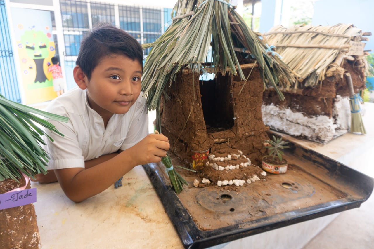 Luz María Cetz Cetina, alumna del tercer año, explicó que en la elaboración de su casita maya se inspiró en la casa antigua de sus abuelos, y con ayuda de sus padres realizó la réplica exacta, utilizando barro, guano y madera, para lograr la tradicional vivienda maya.