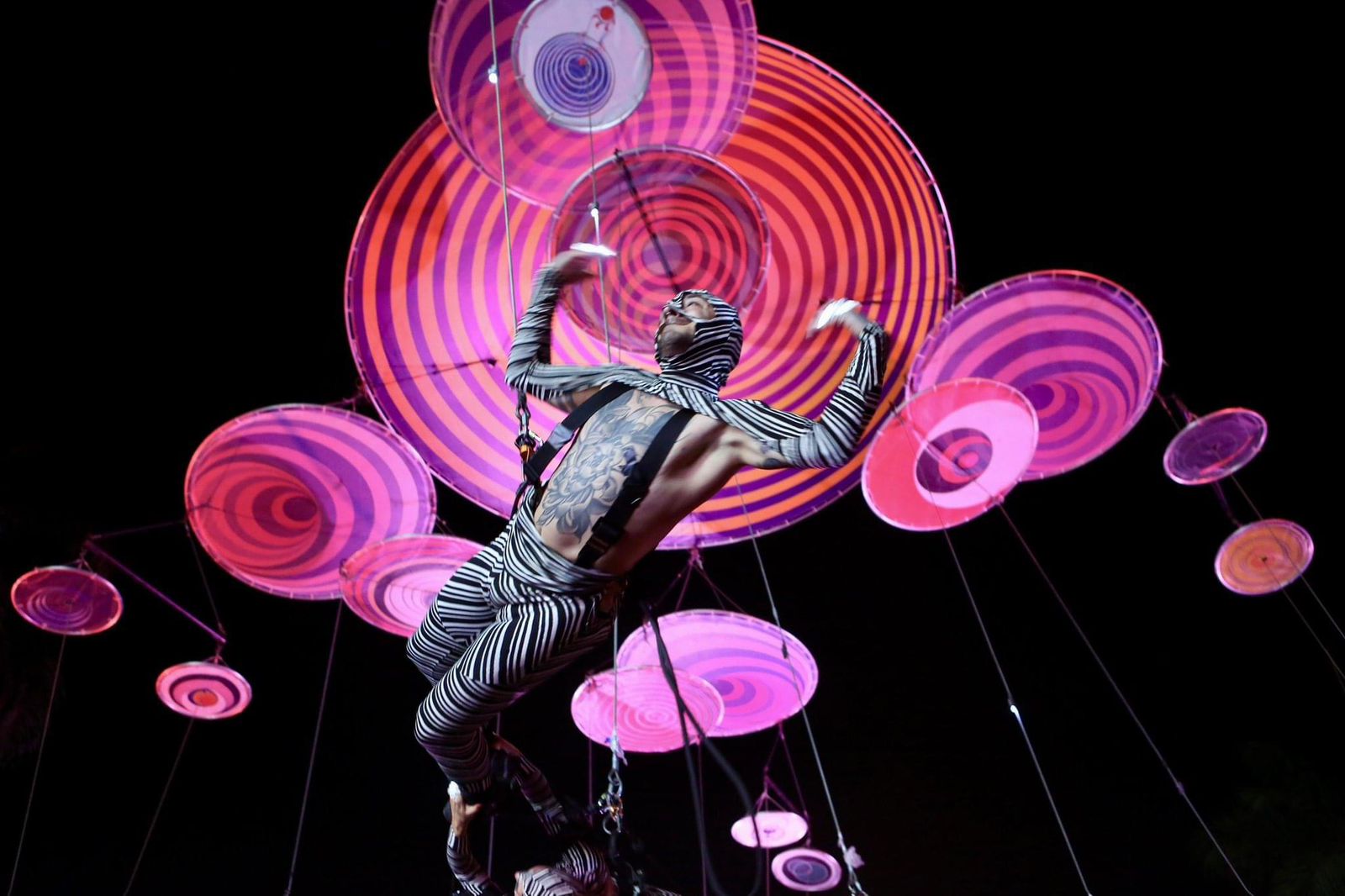 Conforme el show avanza, los acróbatas interactúan con el público, motivados por la música. En momentos de intensidad clave, tiran desde aire confeti, haciendo lucir de colores el cielo desde donde rotan con ritmo, entrelazando sus cuerpos para crear patrones de movimiento.
