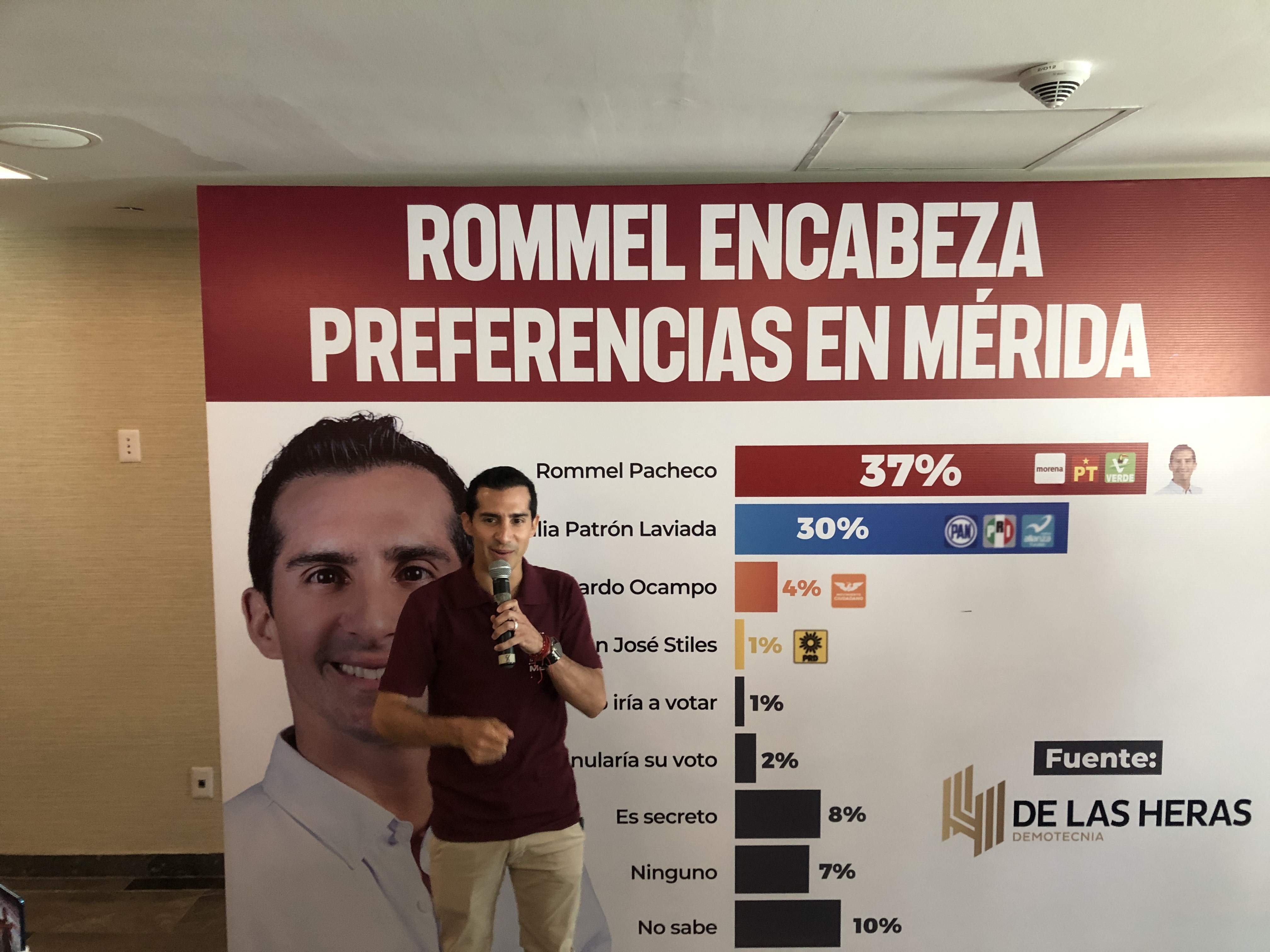 Rommel destacó una encuesta realizada por la De las Heras que lo coloca siete puntos arriba en la preferencia del electorado respecto a su rival, Cecilia Patrón, y celebró que la ciudadanía apoye la llegada de Morena y la Cuarta Transformación en Mérida y en todo Yucatán.