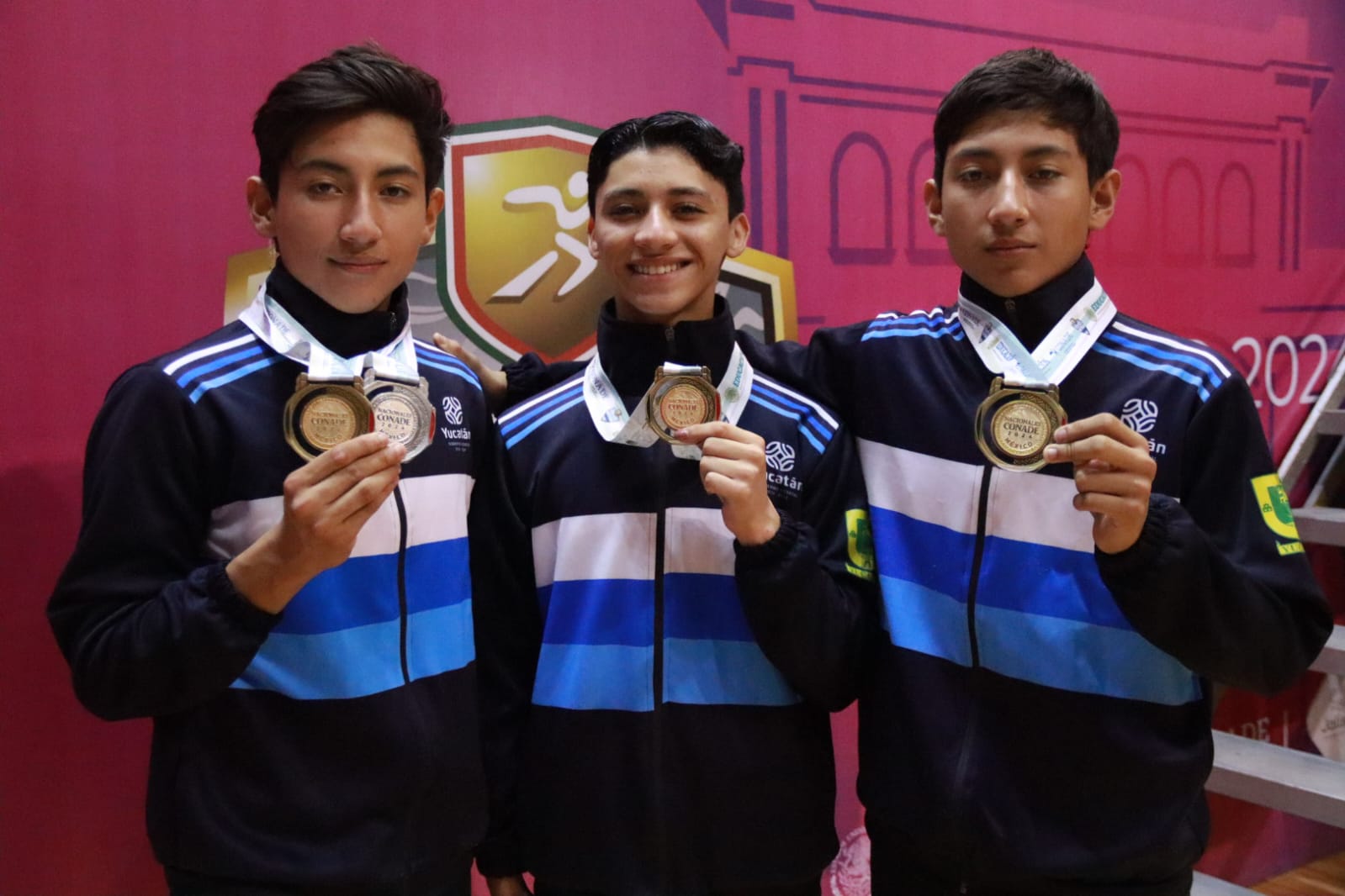 Santiago Ayala Gutiérrez, Roberto Ayala Gutiérrez y Wesley Pech Andrade lograron para Yucatán el segundo oro que gimnasia de trampolín deja en los Nacionales Conade 2024, junto a una plata y bronce obtenidos también durante la segunda fecha de este deporte que se realiza en el Polideportivo Alcalde.