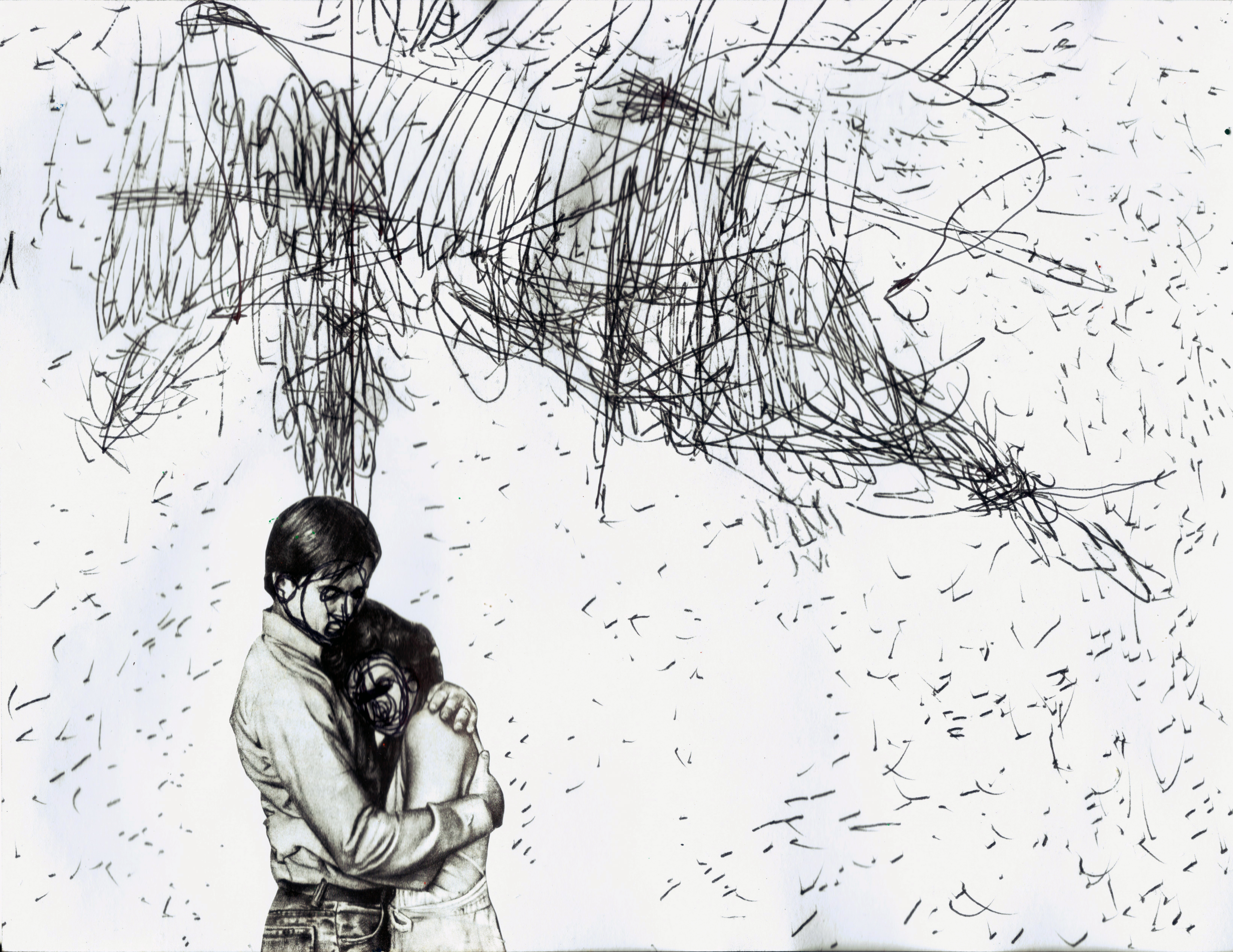 “En estas 20 piezas, algunas medianas y otras pequeñas, hay tres momentos. La obra más clásica representa personajes aislados viendo hacia un horizonte deslavado. Luego hay una serie de espíritu punk con imágenes en negativo. Por último, están las obras de gran formato, en las que hay un arrebato en el trazo, las estructuras y composiciones”.