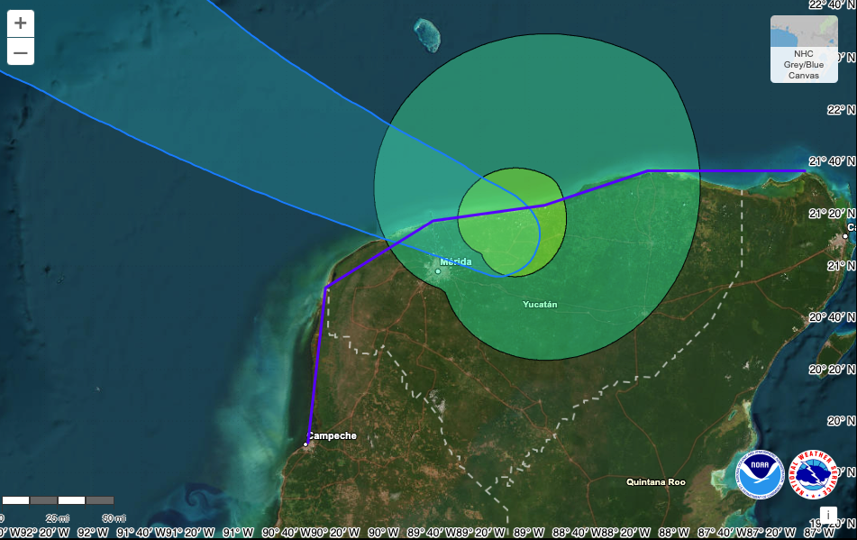 La Coordinación Estatal de Protección Civil (Procivy) informó que la tormenta tropical se ubica a 55 kilómetros al este-sureste de Progreso, Yucatán y se traslada al oeste-noroeste a 24 kilómetros por hora.