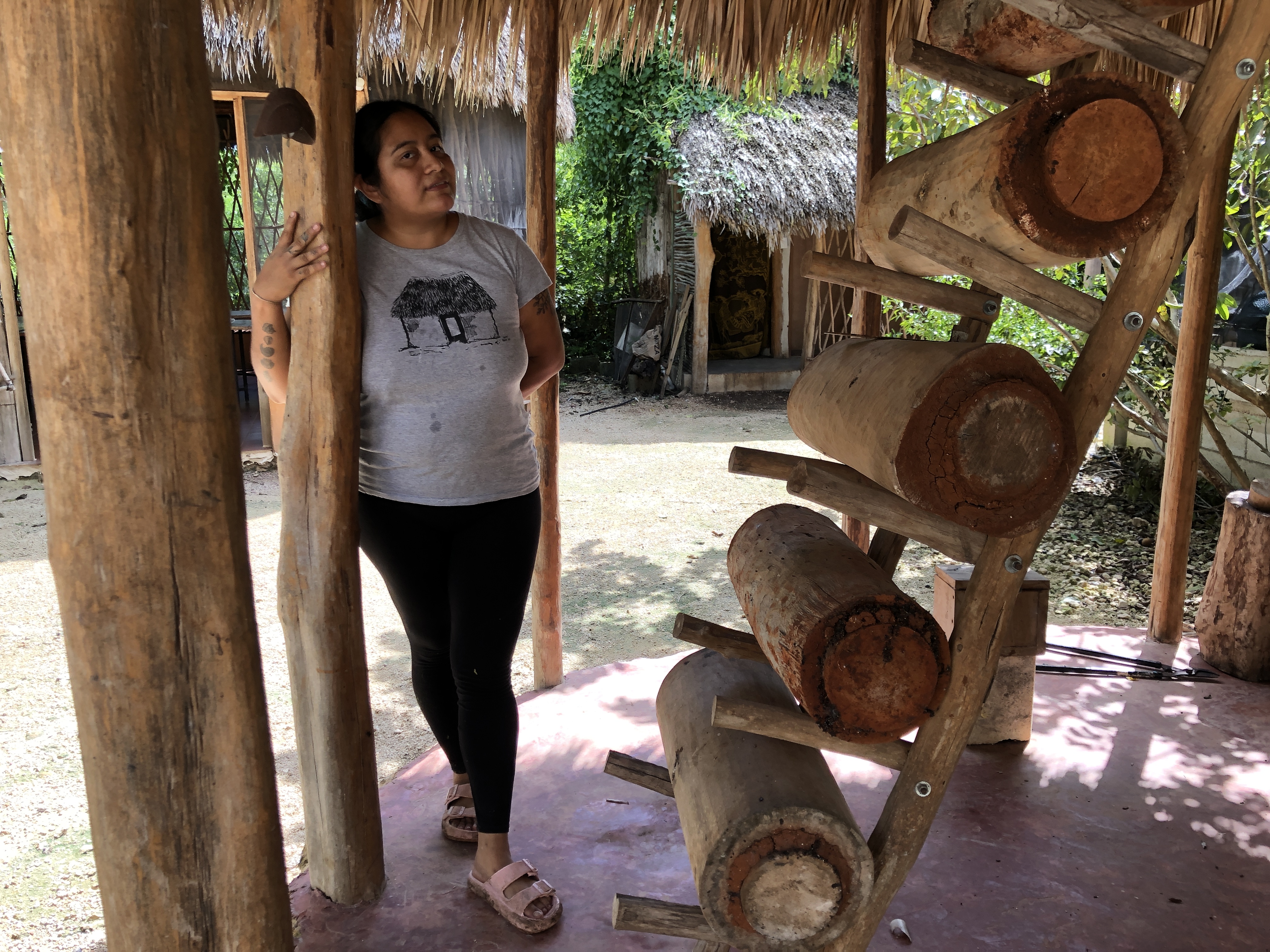 “Ángel es constructor. Él se dedica a construir estas estructuras en la casa maya, ahorita ya se volvió un maestro en la comunidad de esta arquitectura vernácula, él enseña a otros y a otras a cómo hacer las casas y también es carpintero y herrero y hemos hecho talleres de capacitaciones, sobre todo con otras compañeras, para aprender a hacer nuestros propios muebles, albañilería, plomería y más que nada a demostrar que desde la vida cotidiana podemos dejar de depender del sistema, extractivo, capitalista y patriarcal desde lo pequeñito”.